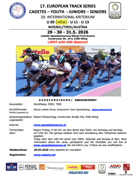 Dieses internationale Speedskating-Event findet auf der brandneuen Vesmaco Speed Bahn in Wörgl statt, und hat sich einen Ruf als einer der kultigsten Austragungsorte Europas für Rennen auf hohem Niveau erworben. Vor der atemberaubenden Kulisse der Tiroler Alpen bietet unsere 250 m lange Strecke auch in Zukunft ein einzigartiges Rennerlebnis.